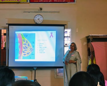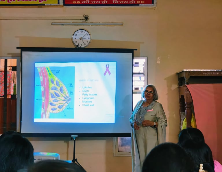 At Sangini Cancer Care Society, we believe awareness is the key to prevention and early detection of breast cancer. Through regular awareness sessions, workshops, and community outreach programs, we educate women on the importance of self-breast examination, recognizing early signs, and seeking timely medical advice. Our initiatives reach schools, colleges, corporate offices, and residential communities to ensure that accurate information about breast health is accessible to all.